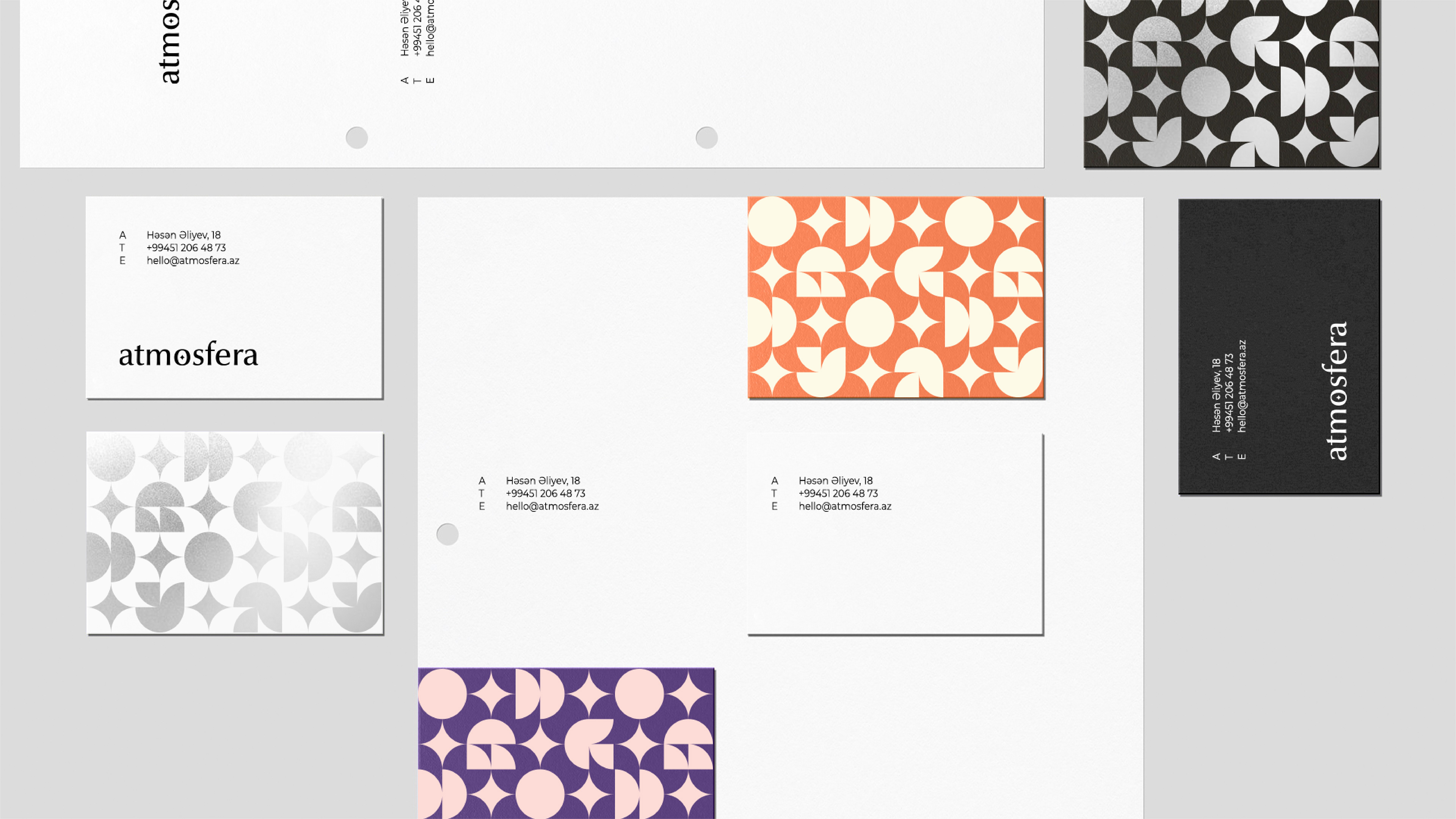 The colour system is where the identity earns its flexibility. A broad palette spanning warm and cool, light and dark, vibrant and restrained — designed to shift tone depending on the occasion. A dream wedding calls for something different than a birthday party, and the brand moves with it. The geometric pattern, built from the same star form, travels across collaterals and surfaces, giving every touchpoint a texture that is distinctly Atmosfera regardless of which colour it wears.