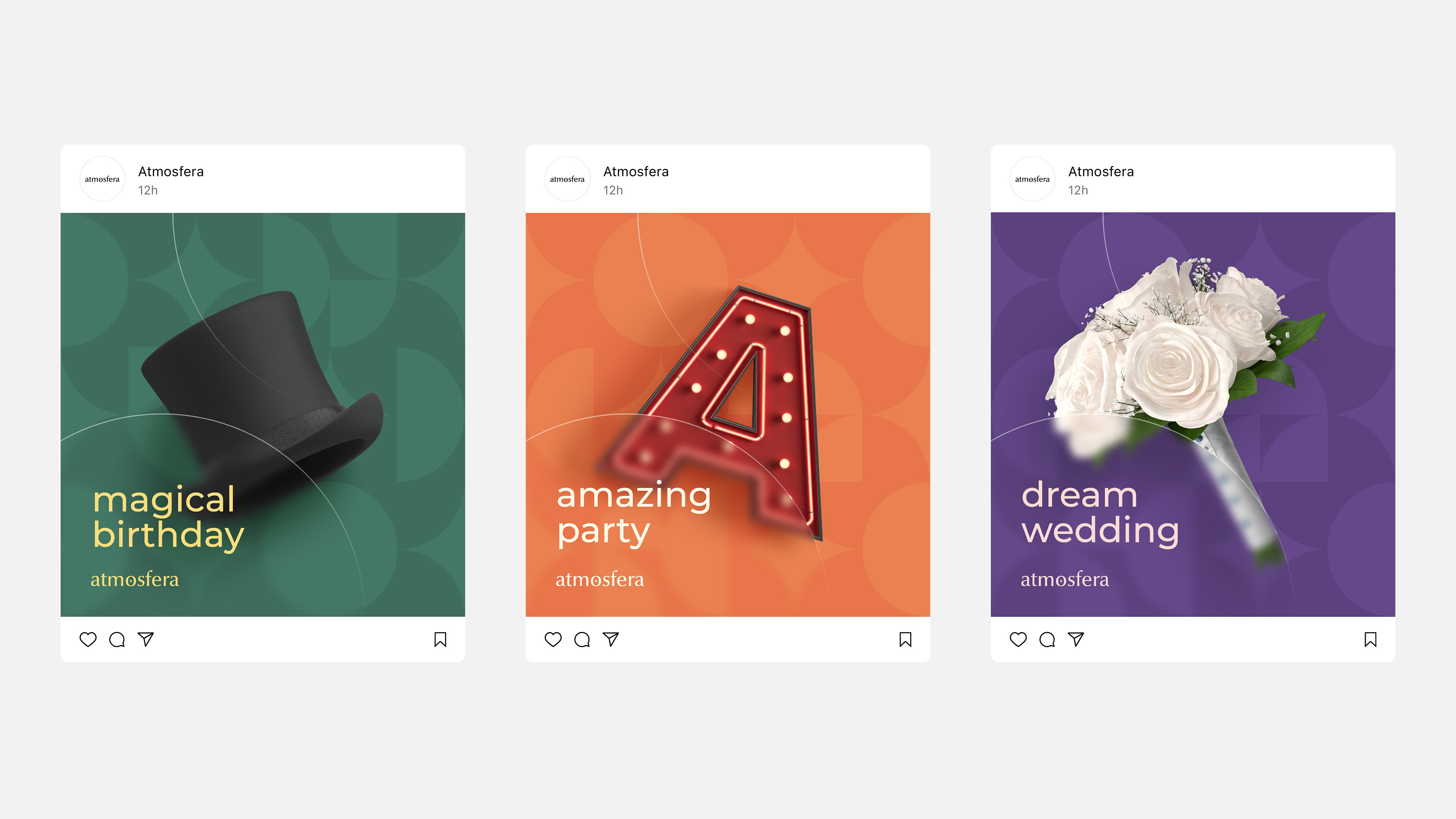 Atmosfera is an event company built around one thing — creating the right feeling for the right moment. Weddings, birthdays, celebrations of all kinds. The identity had to be as versatile as the events themselves.