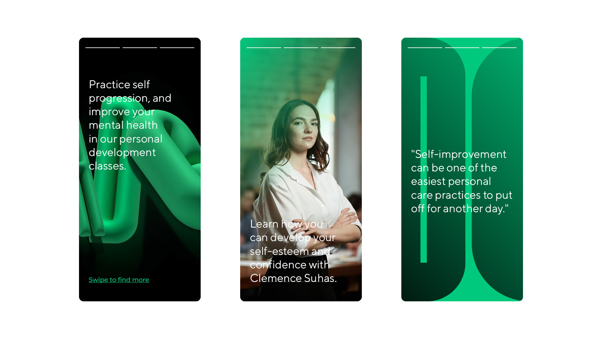 Green grounds the identity in that same idea — vitality, forward motion, potential. Applied across natural imagery and bold 3D executions, the brand holds its meaning whether it's quiet or commanding.