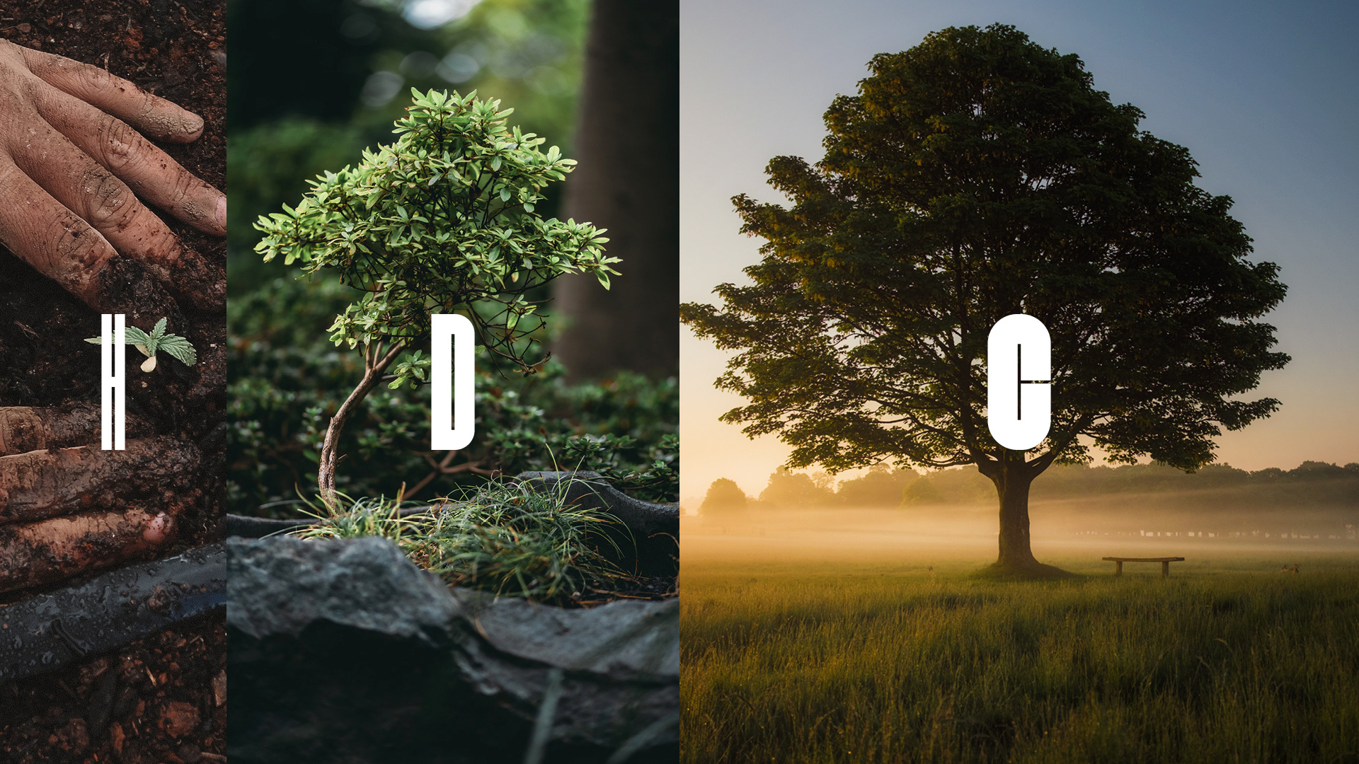 The three letters of the monogram — H, D, C — increase in size from left to right. Not randomly, but deliberately. Each letter is larger than the last, making growth visible in the mark itself. The typography does the work without needing to explain it.