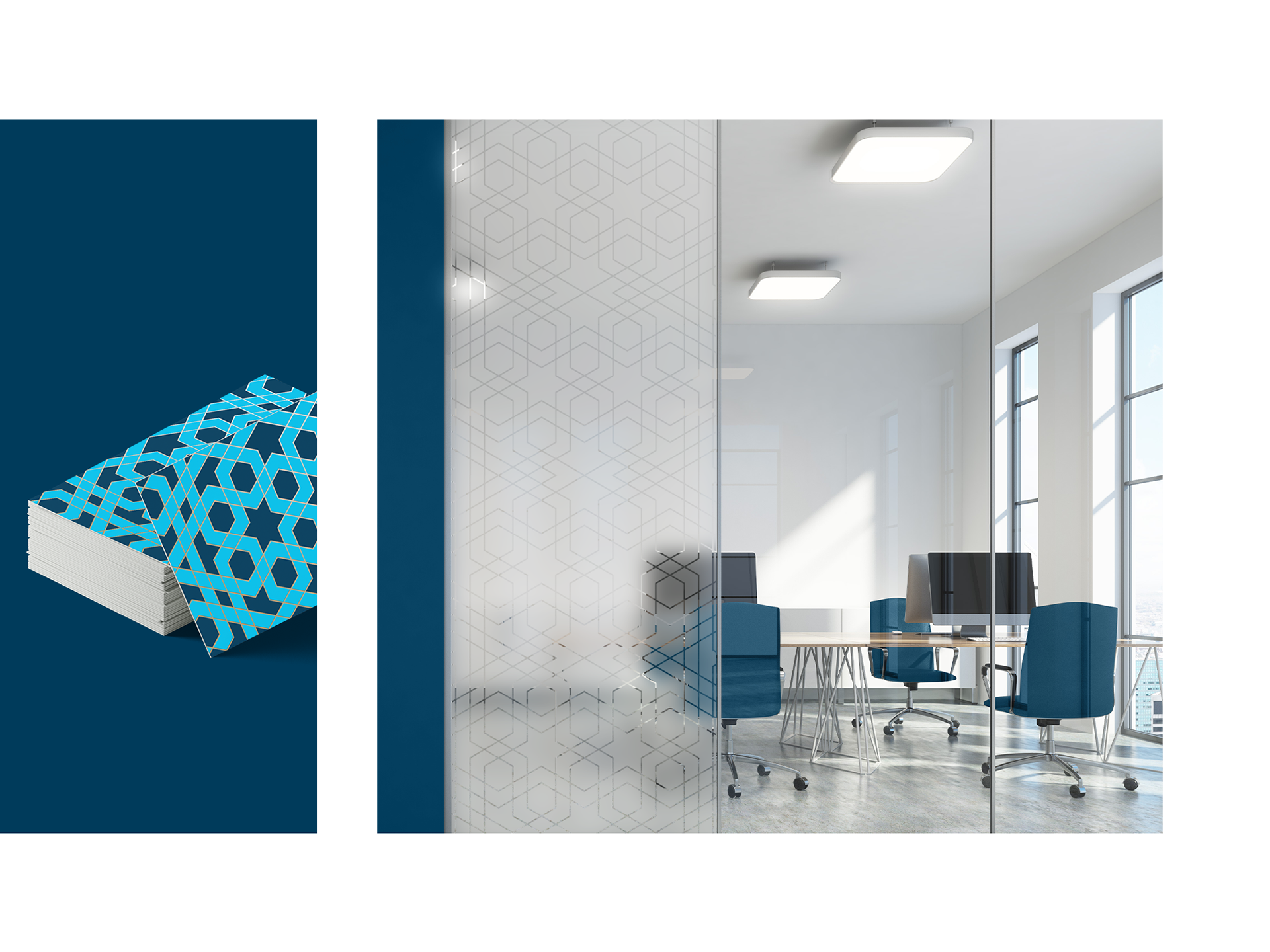 A geometric system inspired by one of the mosque’s interior wall patterns became the foundation of the brand pattern. The structure was simplified and reconstructed using a controlled brand color palette, resulting in a contemporary visual system that balances cultural depth with corporate clarity.